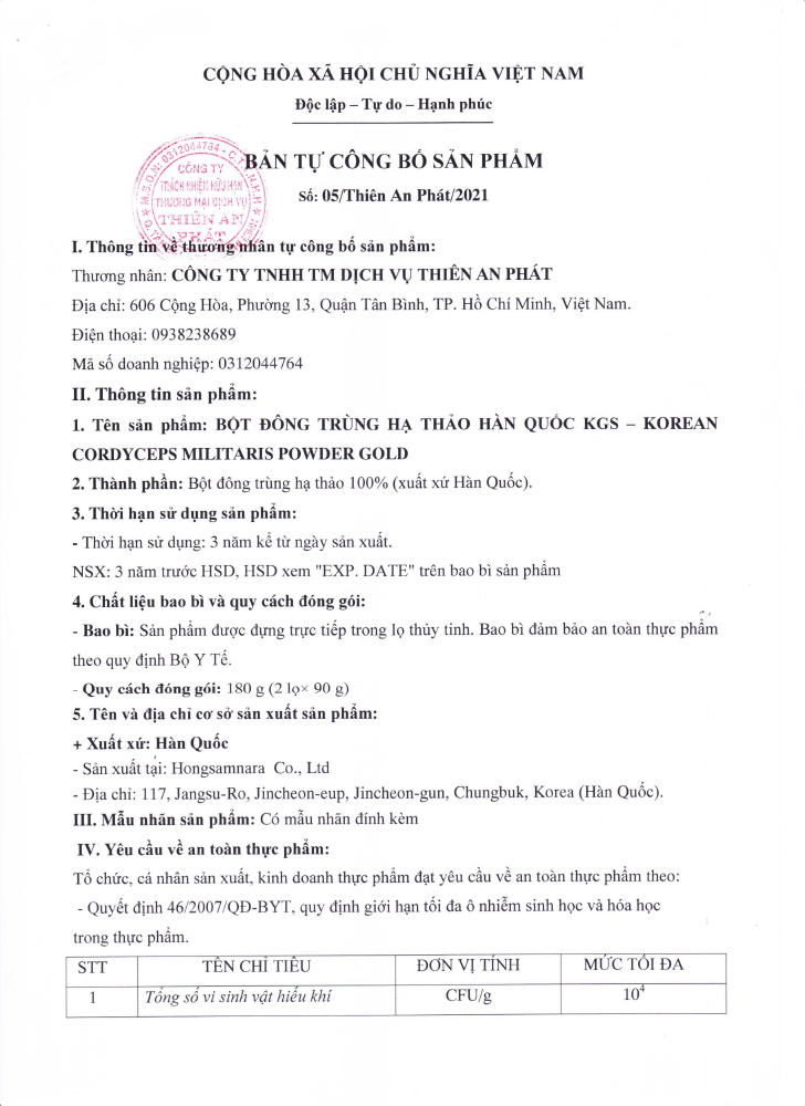 Thành phần bột đông trùng hạ thảo KGS Hàn Quốc: Gồm 17 axít amin khác nhau như D-mannitol, lipit, nguyên tố vi lượng (Al, Si, K, Na…, axít cordiceptic, cordycepin, adenosin, hydroxyethyl-adenosin…, vitamin B12, vitamin A, vitamin C, vitamin B2 (riboflavin), vitamin E, vitamin K...).