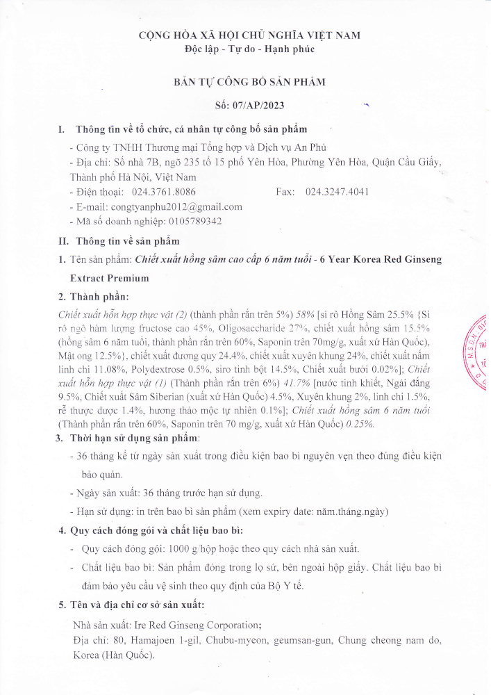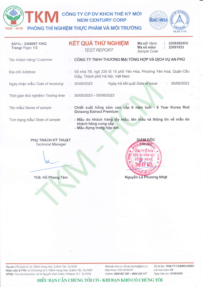 - Hồng sâm 6 tuổi cô đặc 4% (chất rắn 60%, saponin hồng sâm 70mg/g trở lên, sản xuất trong nước)