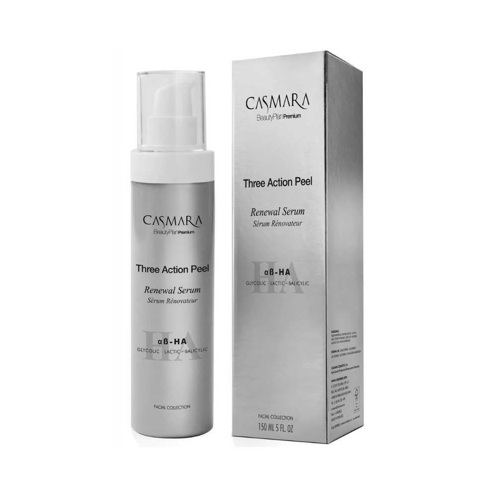 Tẩy Da Chết Hoá Học 3 Cấp Độ Casmara Three Action Peel Renewal Serum là sản phẩm tẩy tế bào chết dạng gel ứng dụng cơ chế hoạt động ba cấp độ, giúp làm sạch da theo nhiều tầng khác nhau. Sản phẩm sử dụng sự kết hợp của các acid thuộc nhóm AHA và BHA, mang lại khả năng tác động đồng thời trên bề mặt, trung gian và sâu trong da, từ đó hỗ trợ loại bỏ lớp tế bào cũ, bã nhờn và tạp chất tích tụ trong lỗ chân lông.