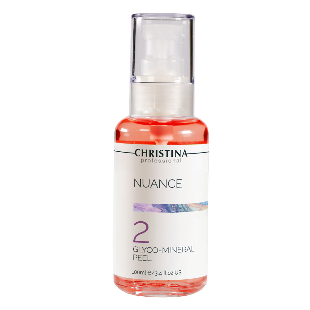 Dung Dịch Peel Tái Tạo Sâu, Căng Bóng & Khắc Phục Đa Vấn Đề Da Christina Nuance - 2 Glyco-Mineral Peel là dung dịch peel chuyên nghiệp độc đáo, kết hợp phức hợp mạnh mẽ 20% từ 3 nhóm axit (AHA, BHA, PHA) hoạt động ở các cấp độ da khác nhau. Sản phẩm này giúp làm sạch sâu, tinh chỉnh kết cấu da, kích thích quá trình đổi mới tế bào và tăng cường rạng rỡ. Nuance Glyco-Mineral Peel hướng tới đa vấn đề da như dày sừng, xỉn màu, kết cấu không đồng đều, nếp nhăn và sắc tố. Đồng thời, sản phẩm còn được tăng cường với Urea làm mềm da và chiết xuất Capsicum kích thích vi tuần hoàn, giúp da mềm mịn, sáng khỏe và tràn đầy sức sống.