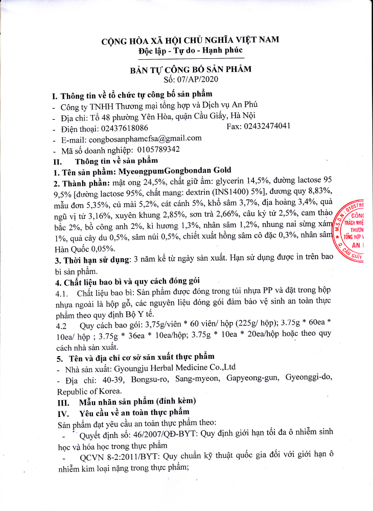 Chiết xuất đông trùng hạ thảo hàn quốc (nhóm Militaris) chiếm 12.54%, Mật ong hàn quốc, Glycerin, bạch chỉ hàn quốc, lactose (sữa, dextrin), địa hoàng, giần sàng, ngũ gia bì, sơn tra, bạch truật, mẫu đơn, cam thảo, Ulmus davidiana. Chiết xuất hồng sâm hàn quốc ( ginsenoside 70mg/g) chiếm 0.5%.