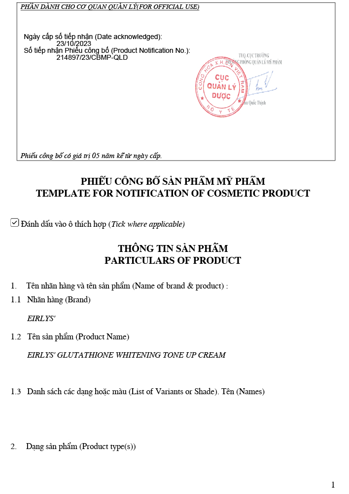 Eirlys Glutathione Whitening Tone Cream - Kem Dưỡng Trắng Da