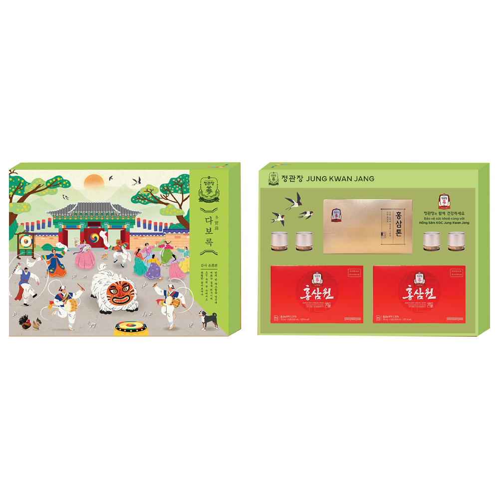 Không chỉ là một món quà sức khỏe, Sở Nguyệt Thành Tựu còn mang trong mình lời chúc hạnh phúc và thành công. Điểm nhấn của Sở Nguyệt Thành Tựu nằm ở thiết kế với họa tiết nghệ thuật lấy cảm hứng từ văn hóa Hàn, gam màu xanh tự nhiên biểu trưng cho sức sống. Mỗi chi tiết đều được chăm chút để mang lại trải nghiệm quà tặng cao cấp nhất của Jung Kwan Jang – KGC.