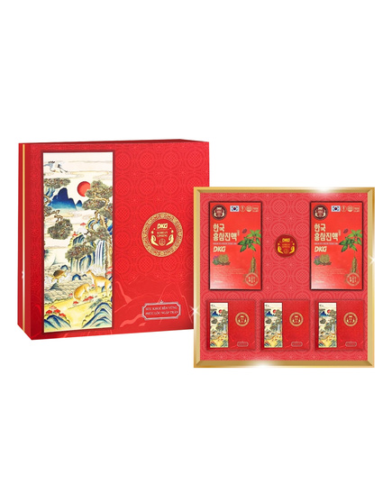 - 02 Hộp Nước Hồng Sâm Hàn Quốc DKG 70ml: Được chiết xuất từ hồng sâm 6 năm tuổi, nước hồng sâm là biểu tượng cho sức khỏe dồi dào và năng lượng bền bỉ. Trong dịp Tết, một hộp nước hồng sâm gửi trao còn là lời chúc mạnh khỏe, minh mẫn và trường thọ cho người nhận.