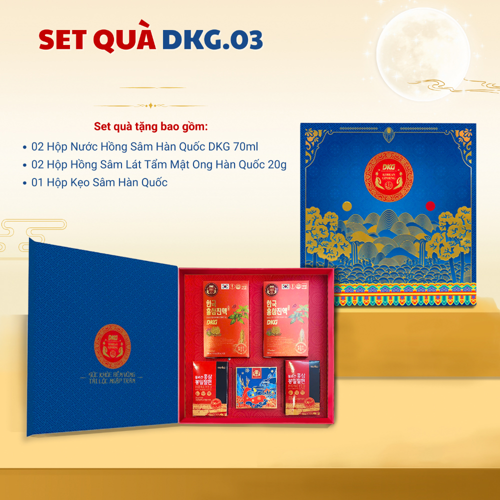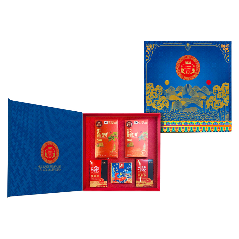 - 02 Hộp Nước Hồng Sâm Hàn Quốc DKG 70ml: Được chiết xuất từ hồng sâm 6 năm tuổi, nước hồng sâm là biểu tượng cho sức khỏe dồi dào và năng lượng bền bỉ. Trong dịp Tết, một chai nước hồng sâm gửi trao còn là lời chúc mạnh khỏe, minh mẫn và trường thọ cho người nhận.