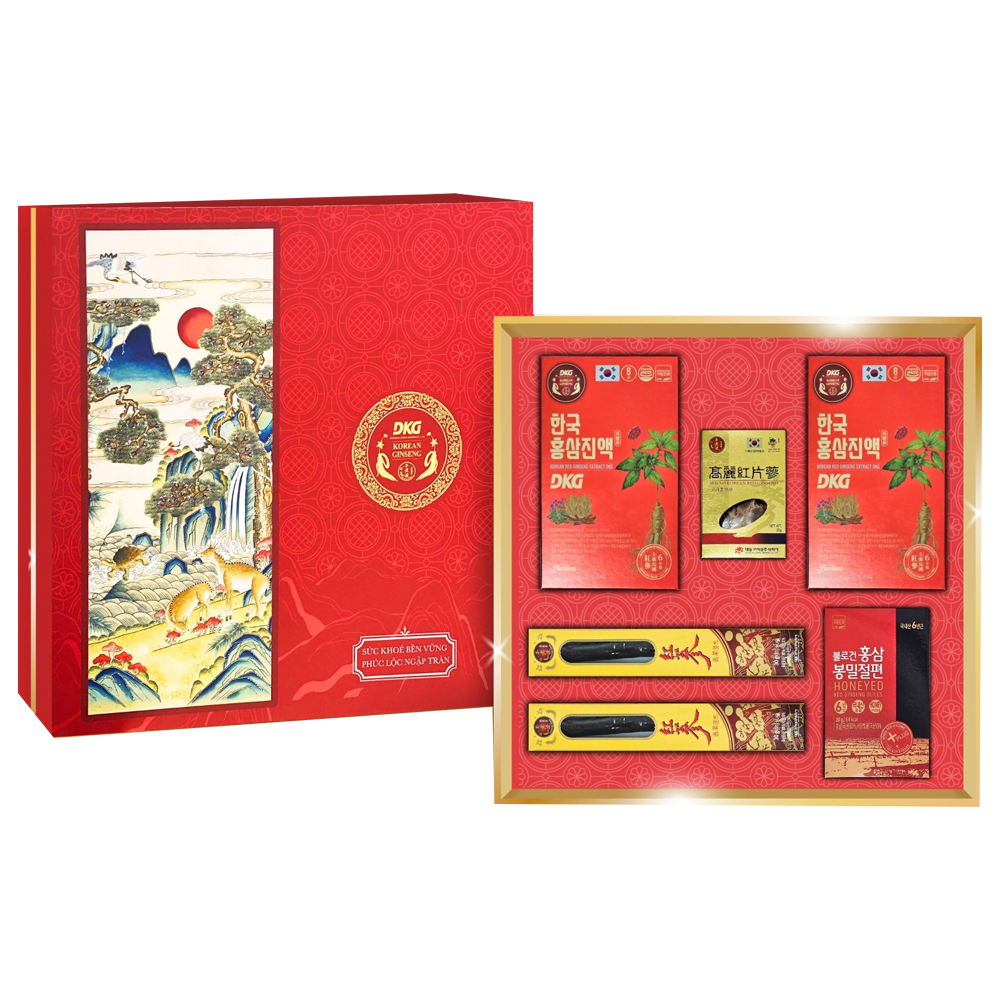 - 02 Hộp Nước Hồng Sâm Hàn Quốc DKG 70ml: Được chiết xuất từ hồng sâm 6 năm tuổi, nước hồng sâm là biểu tượng cho sức khỏe dồi dào và năng lượng bền bỉ. Trong dịp Tết, một chai nước hồng sâm gửi trao còn là lời chúc mạnh khỏe, minh mẫn và trường thọ cho người nhận.