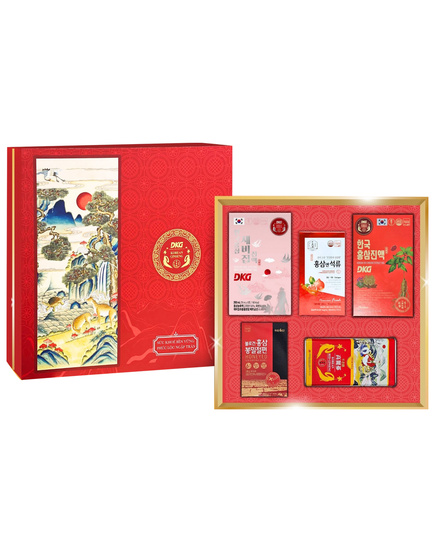 - 01 Hộp Nước Hồng Sâm Hàn Quốc DKG 70ml: Được chiết xuất từ hồng sâm 6 năm tuổi, nước hồng sâm là biểu tượng cho sức khỏe dồi dào và năng lượng bền bỉ. Trong dịp Tết, một chai nước hồng sâm gửi trao còn là lời chúc mạnh khỏe, minh mẫn và sức khoẻ cho người nhận.
