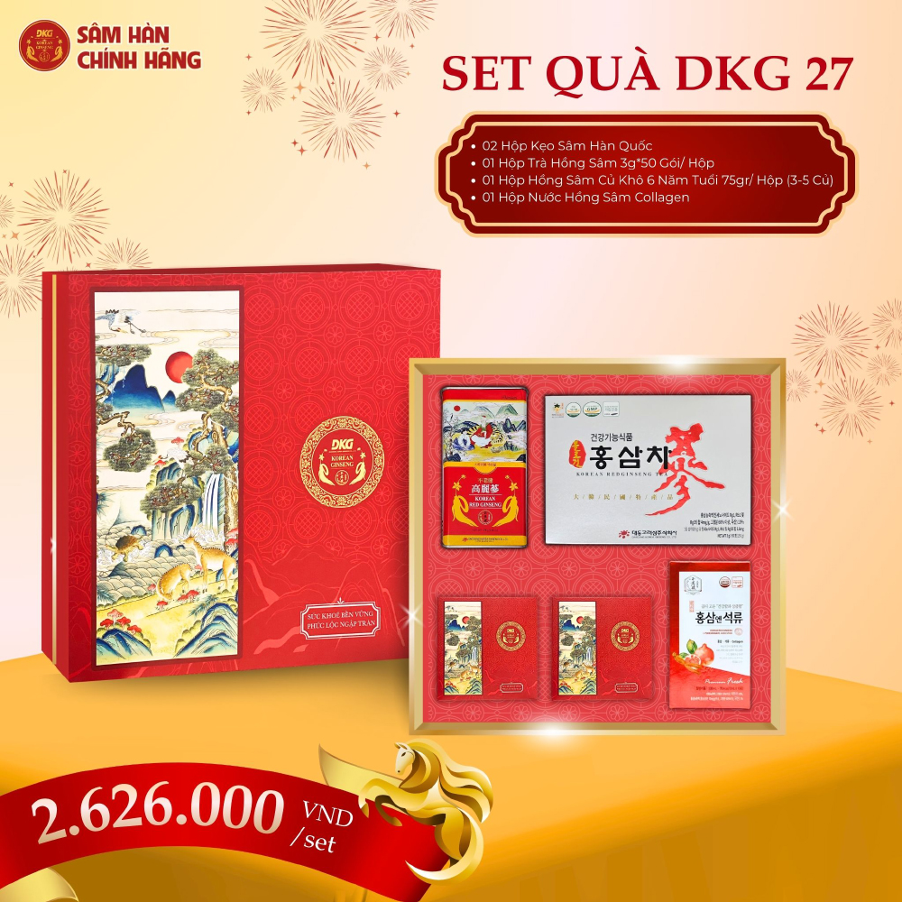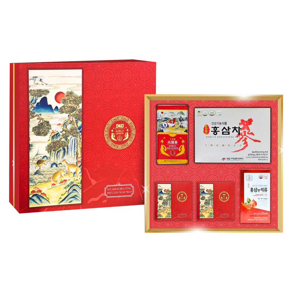 Trong dịp Tết đoàn viên, một món quà không chỉ đẹp về hình thức mà còn chứa đựng giá trị sức khỏe chính là lời chúc ý nghĩa nhất. Set quà DKG.27 được thiết kế để mang đến sự trọn vẹn - vừa sang trọng, vừa chăm sóc sức khỏe, vừa gửi gắm tình cảm chân thành với sắc xanh hoàng gia và hoa văn tinh xảo, hộp quà toát lên vẻ trang nhã, đẳng cấp. Bên trong là sự kết hợp tinh hoa từ hồng sâm Hàn Quốc như kẹo sâm ngọt dịu, trà hồng sâm thanh mát, hồng sâm củ khô 6 năm tuổi quý hiếm và nước hồng sâm lựu Glutathione hiện đại.