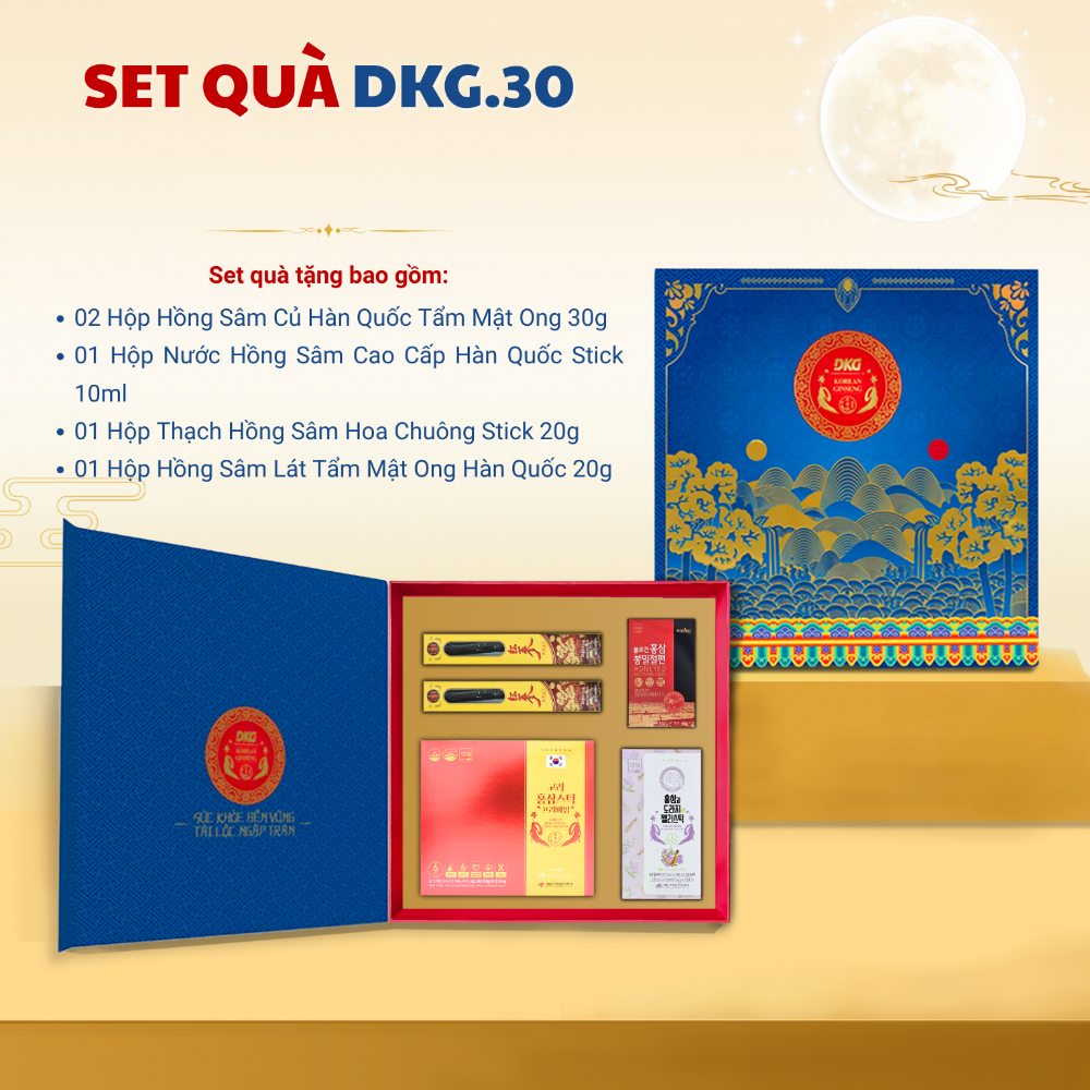 Người trao tặng có thêm một sự lựa chọn cân bằng giữa sự tinh gọn và giá trị sử dụng. Set quà gồm những sản phẩm nhân sâm được ưa chuộng, hỗ trợ tăng cường sức khỏe và đề kháng. Thiết kế hộp sang trọng hơn, thích hợp cho quà biếu gia đình, bạn bè hoặc đối tác thân thiết. DKG.30 vừa mang tính ứng dụng cao vừa thể hiện sự chỉn chu trong cách trao tặng. Đây là món quà dành cho những ai muốn gửi lời chúc Tết trang trọng nhưng không quá cầu kỳ. DKG.30 – quà sức khỏe, quà kết nối.