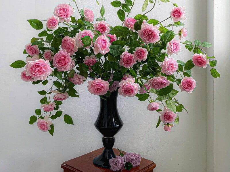 Hoa hồng bỏ bớt phần lá phía dưới để khi cắm vào không bị phân hủy, làm hôi nước. Cắt phần gốc cành 1 góc 45 độ. Các cành cắt dài ngắn khác nhau sao cho hài hòa