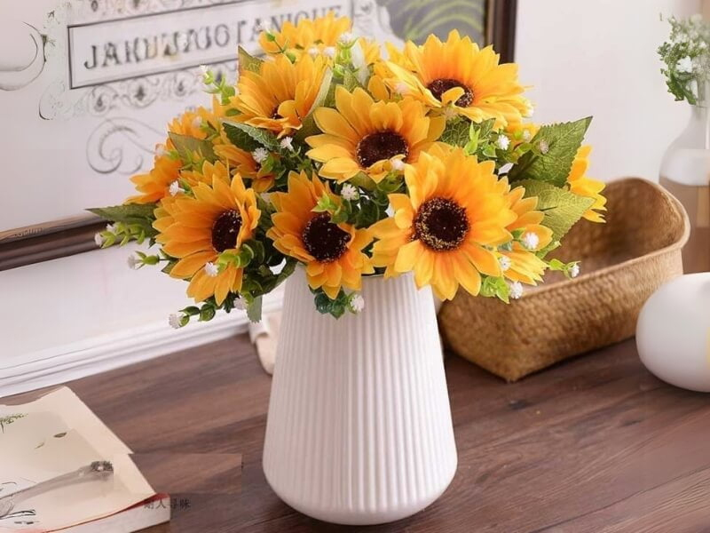 Có thể trang trí thêm hoa cúc, hoa phi yến để bình hướng dương thêm bắt mắt