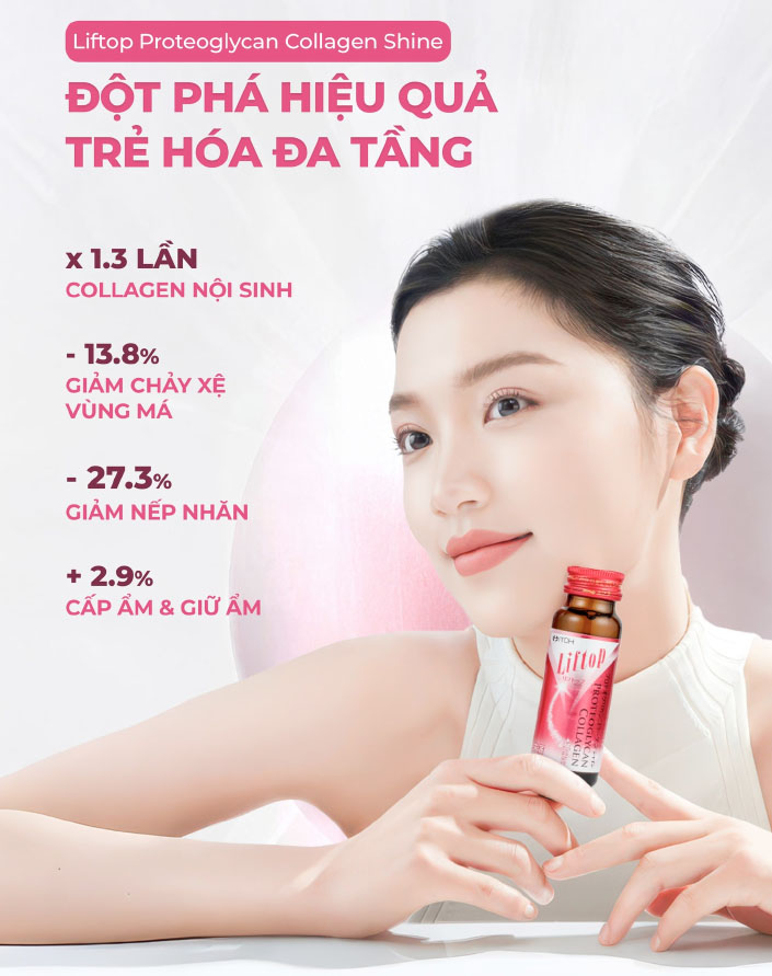 ITOH Liftop Proteoglycan Collagen Shine giúp ngăn ngừa lão hóa sớm, giảm nếp nhăn, tăng độ căng mịn, đồng thời hỗ trợ làm sáng và đều màu da, mang lại làn da tươi trẻ, rạng rỡ và tràn đầy sức sống.