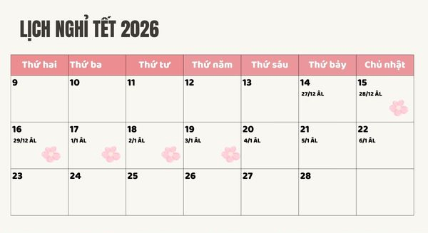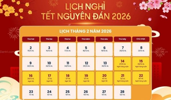 Thông tin về lịch nghỉ Tết Nguyên đán 2026 đã chính thức được công bố, thu hút sự quan tâm của người lao động, cơ quan Nhà nước và doanh nghiệp. Với kỳ nghỉ kéo dài liên tục 9 ngày, Tết Bính Ngọ hứa hẹn mang đến thời gian thuận tiện để sum họp, di chuyển và lên kế hoạch du xuân. Bài viết dưới đây sẽ giúp bạn nắm rõ lịch nghỉ Tết Nguyên đán 2026 chính thức và các lưu ý quan trọng mà bạn cần biết.