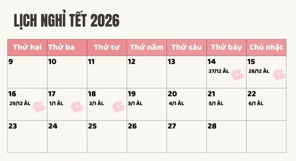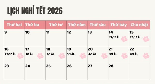 Như vậy, với hầu hết mọi người, kỳ nghỉ Tết Bính Ngọ 2026 sẽ kéo dài khoảng 1-2 tuần. Đây đủ thời gian để sum họp gia đình, chuẩn bị và tham gia các hoạt động Tết.