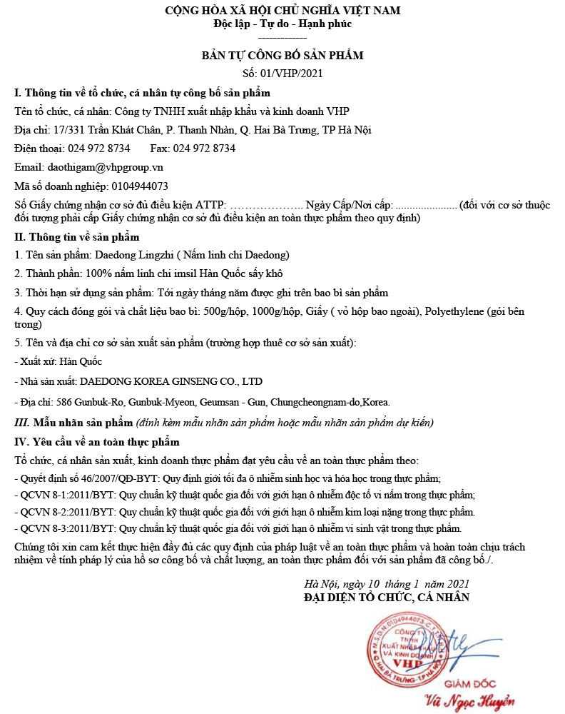 - Với sự hỗ trợ của Daedong Korea Ginseng và VHP Ginseng Nấm Linh Chi Daedong Lingzhi Mushroom Premium Hàn Quốc là sản phẩm Nấm linh chi đầu tiên được nhập khẩu chính ngạch về Việt Nam, đạt mọi tiêu chuẩn kiểm dịch, kiểm định chất lượng tại Hàn Quốc và Việt Nam và được phân phối chính hãng tại hệ thống Siêu Thị Làm Đẹp.