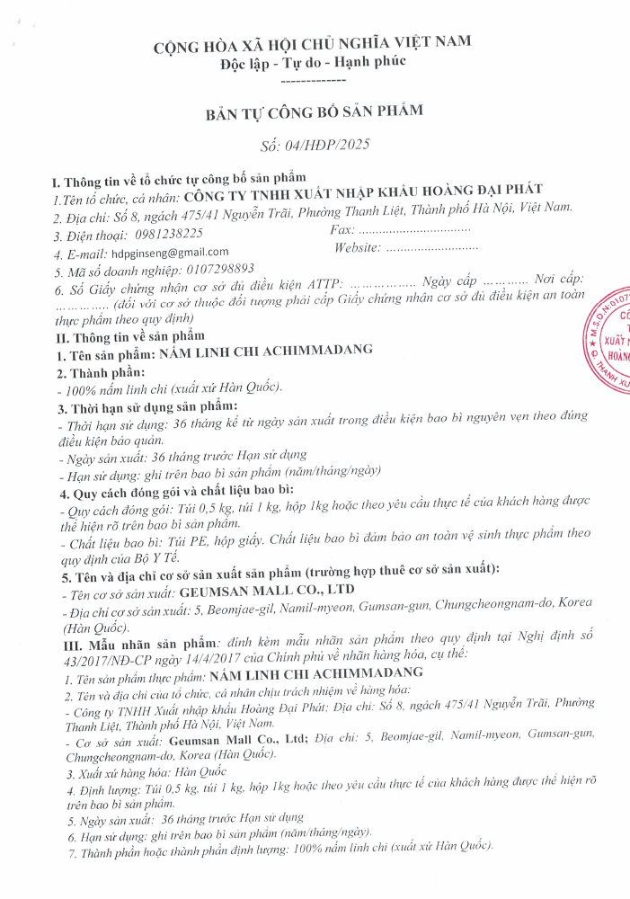 Nấm Linh Chi Đỏ Thượng Hạng Achimmadang Korea Lingzhi Mushroom 1kg là sản phẩm linh chi cao cấp đến từ Hàn Quốc, được nuôi trồng theo quy trình kiểm soát nghiêm ngặt để đảm bảo chất lượng và giá trị dinh dưỡng. Nấm có tai dày, màu đỏ nâu đặc trưng và chứa nhiều hoạt chất quý giúp hỗ trợ bồi bổ sức khỏe, tăng cường sức đề kháng và thanh lọc cơ thể. Sản phẩm thường được sử dụng để nấu nước uống, hãm trà hoặc ngâm rượu, đồng thời cũng là món quà sức khỏe ý nghĩa dành tặng người thân và bạn bè.