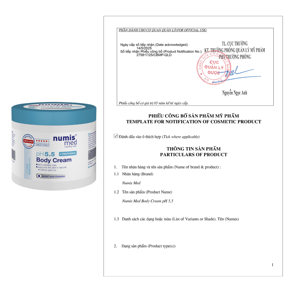 Kem Dưỡng Thể Cấp Ẩm Cho Da Nhạy Cảm Numis Med Body Cream pH 5.5 là kem dưỡng thể chuyên biệt dành cho da nhạy cảm, rất khô, có vảy, chàm, hoặc viêm da cơ địa, giúp dưỡng ẩm sâu, củng cố hàng rào bảo vệ da nhờ công thức cân bằng pH 5.5, Panthenol và Urea, mang lại làn da mềm mại, mịn màng, giảm ngứa và kích ứng hiệu quả, không chứa parabens, silicones, hay dầu khoáng.