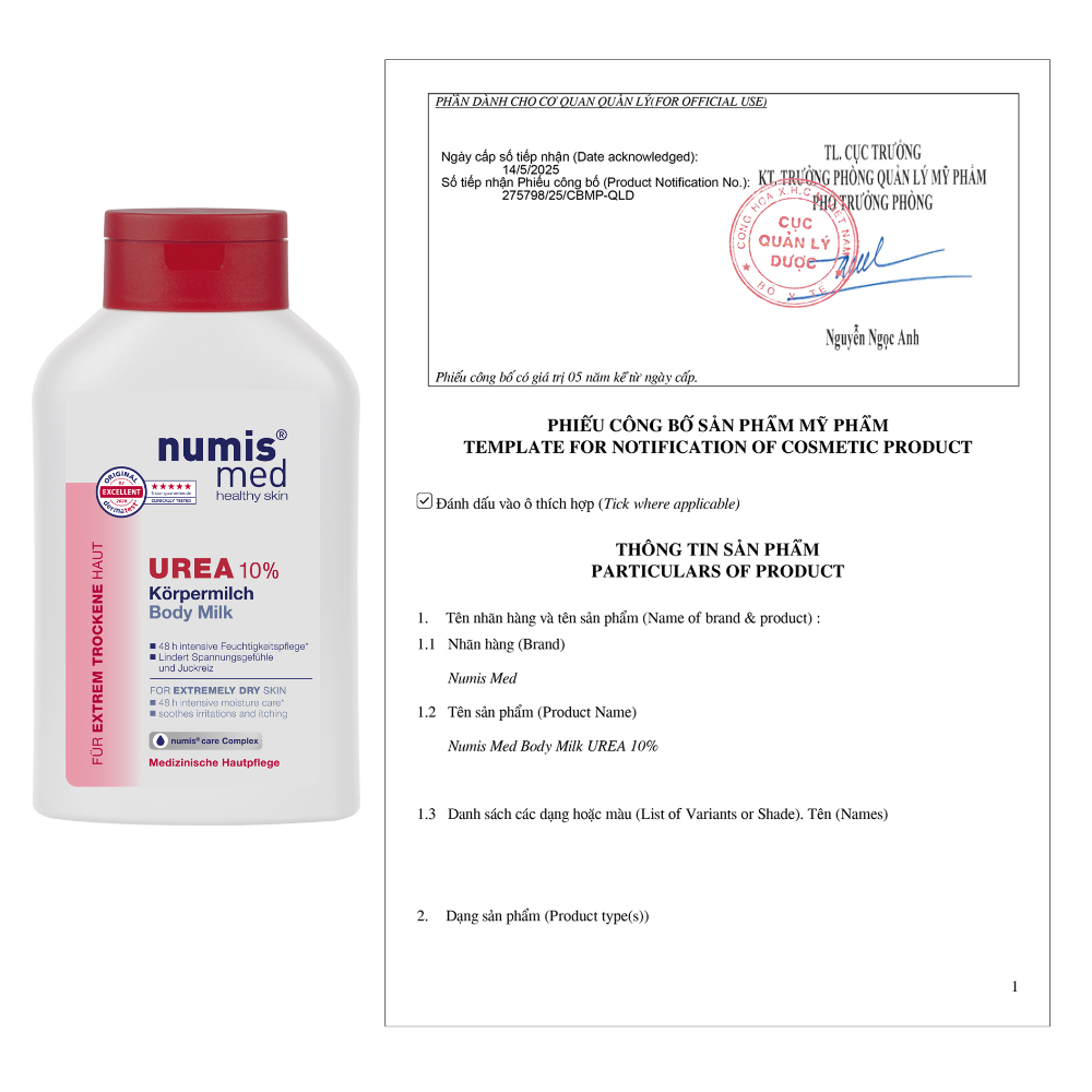 Sữa Dưỡng Thể Numis Med Body Milk Urea 10% là sữa dưỡng thể chuyên sâu cho da cực khô, ngứa, bong tróc, chứa 10% Urea cùng tổ hợp dưỡng chất Numis Care giúp cấp ẩm sâu, giữ ẩm đến 48h, làm dịu cảm giác căng, củng cố hàng rào bảo vệ da, và hỗ trợ chăm sóc da chàm khô, vảy nến. Sản phẩm không hương liệu, không paraben, không silicon, được thử nghiệm lâm sàng, giúp da mềm mại và giảm kích ứng hiệu quả.