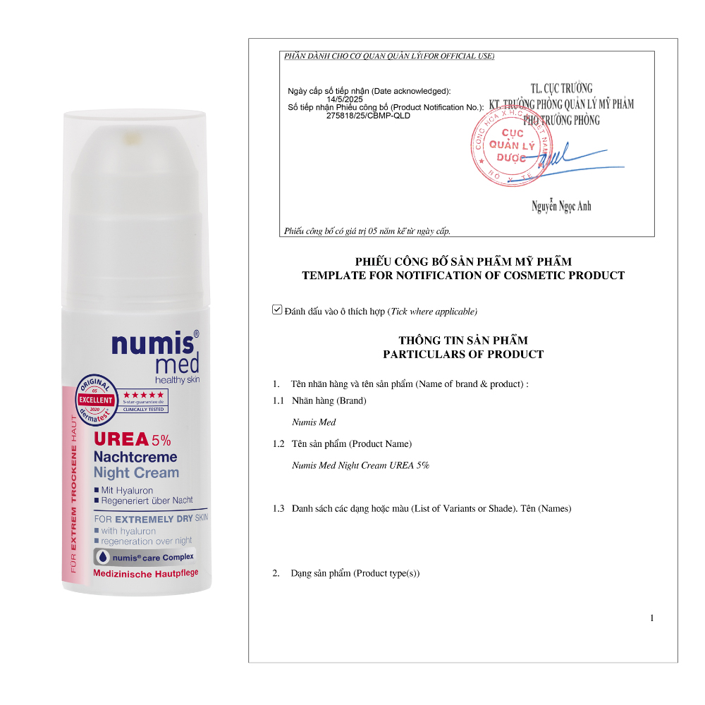 Kem Dưỡng Da Ban Đêm Numis Med Night Cream Urea 5% là sản phẩm chăm sóc da mặt chuyên sâu, cấp ẩm mạnh mẽ nhờ 5% Urea, Hyaluronic Acid, giúp phục hồi da khô, da nhạy cảm (viêm da cơ địa, chàm, vảy nến), làm dịu kích ứng, giảm ngứa, hỗ trợ tái tạo da ban đêm, giảm nếp nhăn nhỏ, cho da mịn màng, mềm mại, không chứa paraben, chất tạo màu, dầu silicon.