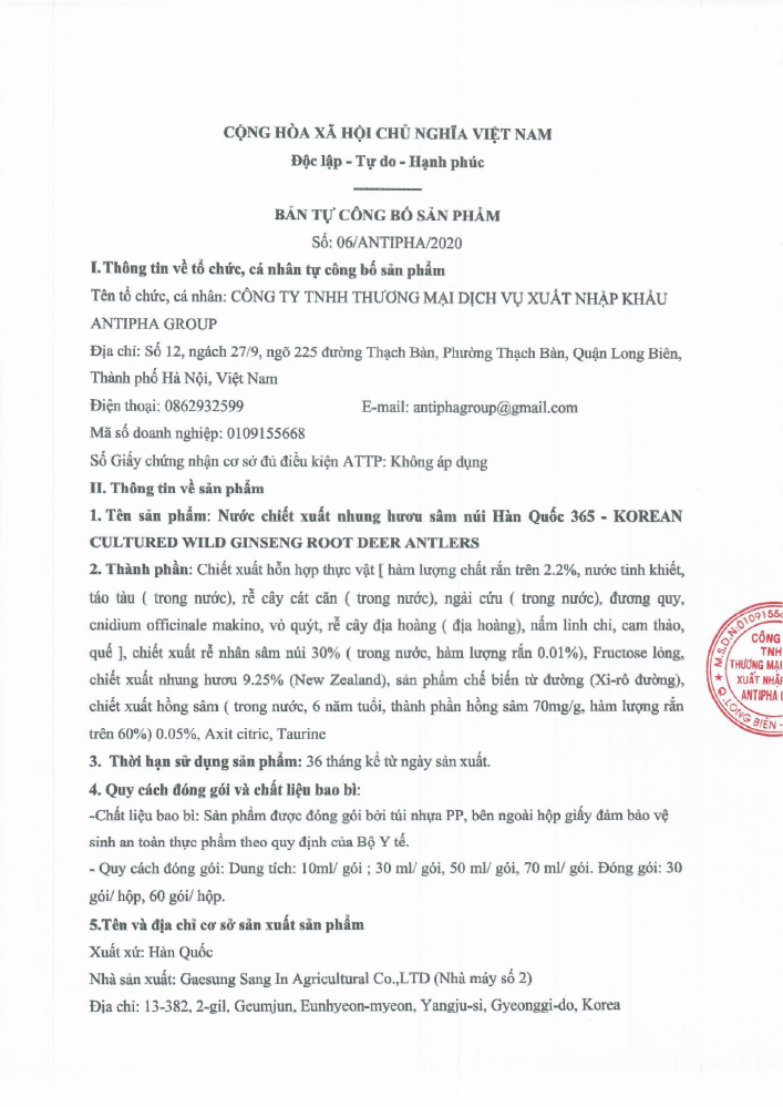 Nước Chiết Xuất Nhung Hươu Hồng Sâm Núi 365 Korean Cultured Wild Ginseng Root Deer Antlers được bào chế từ nhung hươu và nhân sâm núi mọc ngoài thiên nhiên, giúp bồi bổ sức khỏe. Sản phẩm được nghiên cứu và sản xuất bởi đội ngũ chuyên gia của Gaesung Sang In Agricultural Co., Ltd. Sản phẩm được phân phối tại rất nhiều quốc gia trên toàn thế giới. Sản phẩm được bào chế dạng nước uống, có mùi thơm dịu nhẹ. Sản phẩm được đóng gói đóng gói nhỏ 50ml tiện lợi khi sử dụng. Hộp đựng sản phẩm đẹp mắt, sang trọng, đây còn là món quà ý nghĩa dành tặng cho ông bà, cha mẹ, cấp trên, bạn bè và đối tác vào những dịp đặc biệt.