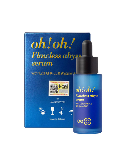 Tinh Chất Giảm Sẹo Lõm, Chống Lão Hoá Oh!Oh! Flawless Abyss Serum là tinh chất chống lão hóa, duy trì vẻ tươi trẻ dài lâu với công thức chứa bộ đôi hoạt chất sáng giá: Copper Tripeptide-1 (GHK-Cu) và EGF (yếu tố tăng trưởng). Peptide công nghệ cao góp mặt trong bảng thành phần với nồng độ 1.2% giúp “vô hiệu hóa” các gốc tự do, sửa chữa các tế bào tổn thương, đồng thời kích thích sản sinh các thành phần quan trọng trong da như Collagen, Elastin và Glycosaminoglycans, từ đó cải thiện độ đàn hồi, săn chắc cũng như làm giảm nếp nhăn trên da. 9,9 ppm EGF giúp cải thiện các nếp nhăn cũ và giảm sự xuất hiện của nếp nhăn mới, đồng thời, kích thích da tăng tốc độ tái tạo tế bào, tái cấu trúc làn da, từ đó nuôi dưỡng một làn da khỏe mạnh.