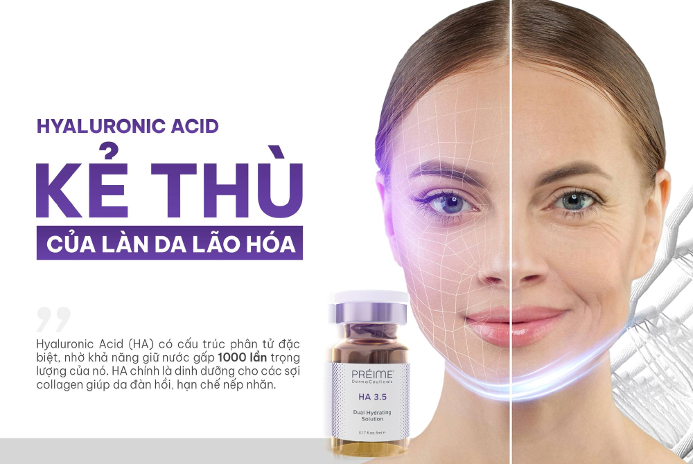 - Hyaluronic Acid (HA) nồng độ 3.5%: Đây là nồng độ cao được thiết kế để mang lại hiệu quả tương đương filler trong việc làm đầy và căng bóng da.
