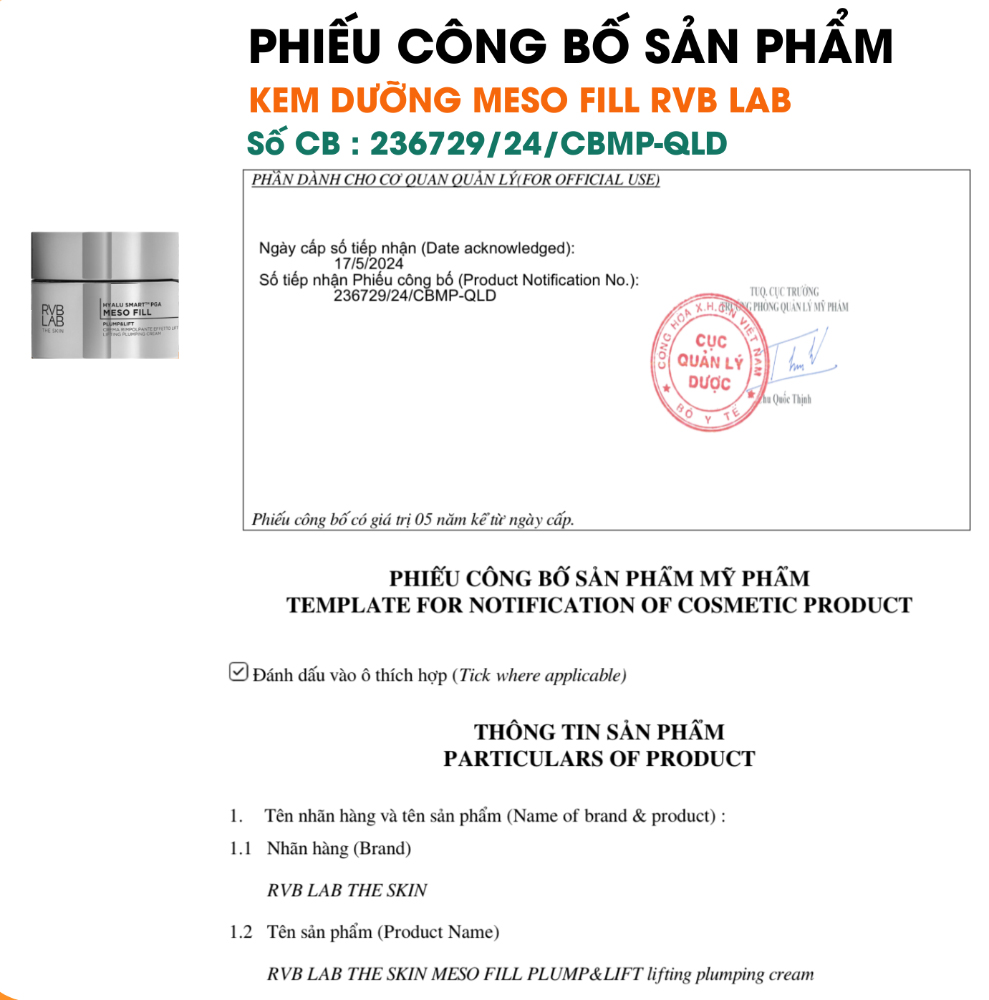 Kem Dưỡng Làm Đầy Và Nâng Cơ RVB LAB Meso Fill Plump & Lift Lifting Plumping Cream là kem dưỡng nâng cơ và tăng độ căng mượt cho da chuyên sâu, thuộc dòng chăm sóc da meso-cosmetic cao cấp từ thương hiệu RVB LAB. Sản phẩm được phát triển để hỗ trợ nâng đỡ cấu trúc da, cải thiện độ săn chắc và làm đầy bề mặt, giúp làn da trông mịn màng, căng đầy và trẻ trung hơn theo thời gian sử dụng.