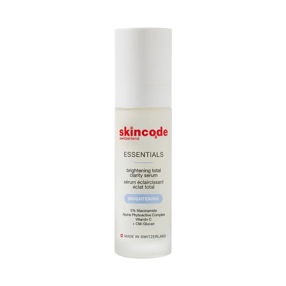 Skincode Essentials Alpine White Brightening Total Clarity Serum - Huyết Thanh Dưỡng Trắng Giảm Nám là dòng sản phẩm dạng serum lỏng nhẹ, thẩm thấu nhanh vào da nổi tiếng với khả năng cải thiện sự đổi màu và sắc tố da vượt trội, được nhiều chuyên gia và người dùng đánh giá cao. Sản phẩm này được điều chế với các đặc tính chữa lành, làm dịu và tái tạo của công nghệ độc quyền CM-Glucan, cùng với Niacinamide và phức hợp chiết xuất từ thực vật Alpine. Mang đến công dụng ức chế melanin, xóa mờ dấu hiệu của sắc tố và các khuyết điểm khác. Tích cực dưỡng da sáng mịn, đều màu trong thời gian nhanh nhất.