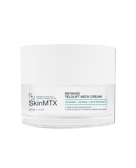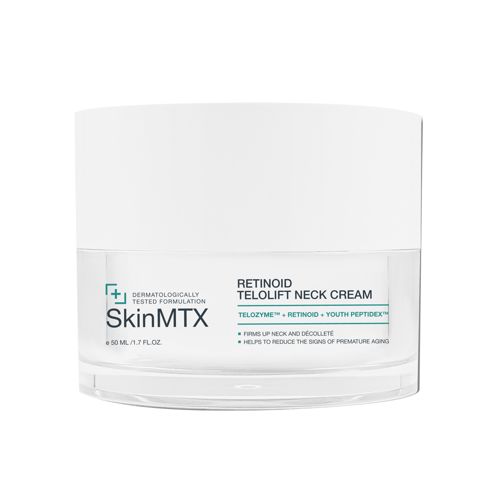 Kem Dưỡng Trẻ Hóa Da Vùng Cổ SkinMTX Retinoid Telolift Neck Cream được phát triển với công thức kết hợp giữa Retinoid và phức hợp TeloZyme Complex, giúp hỗ trợ quá trình tái tạo da, cải thiện kết cấu và mang lại diện mạo mịn màng, săn chắc hơn cho vùng da cổ.